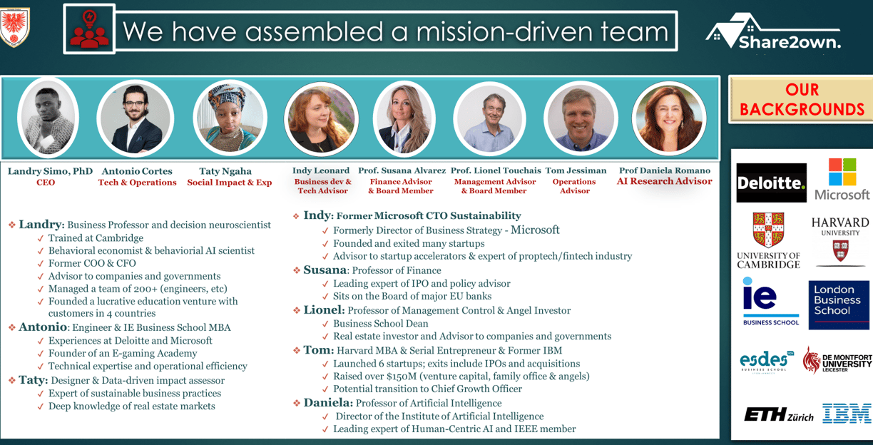 Welcome to Share2own AI, where innovation meets impact! I'm Landry and I am thrilled to lead our extraordinary team of visionaries. At Share2own AI, we are on a mission to harness the power of artificial intelligence to tackle real-world challenges. With a focus on creating positive change and fostering shared prosperity, we aim to redefine industries and empower individuals. Our first focus is real estate, tackling skyrocketing rent prices and unachievable homeownership. Join us on this exciting journey as we pioneer next-generation AI solutions that make a meaningful difference in people's lives.